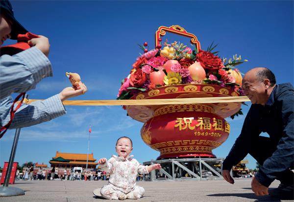 9月22日,国庆75周年“祝福祖国”巨型花篮吊装完成,亮相天安门广场。依照礼制在天安门广场设置的立体花坛以喜庆的蔬果花篮为主题,篮内选取了美好寓意的蔬果和花卉,体现“蔬果飘香 繁花似锦”,表达对祖国繁荣富强、欣欣向荣的美好祝福。图为一个7个月的小朋友在大花篮前留影。图/视觉中国
