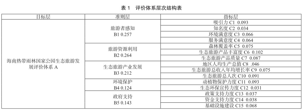 在借鉴已有研究基础上,根据丛小丽(2019)提出的生态旅游系统是由生态旅游者、生态旅游资源、生态旅游业、生态旅游环境和生态旅游政府五大要素组成的研究,文章通过使用层次分析法和德尔菲法构建了海南热带雨林国家公园生态旅游发展评价体系,准则层为旅游者感知、旅游资源利用、生态旅游产业发展、环境保护和政府支持五个方面;指标层由15个评价指标组成[4]。