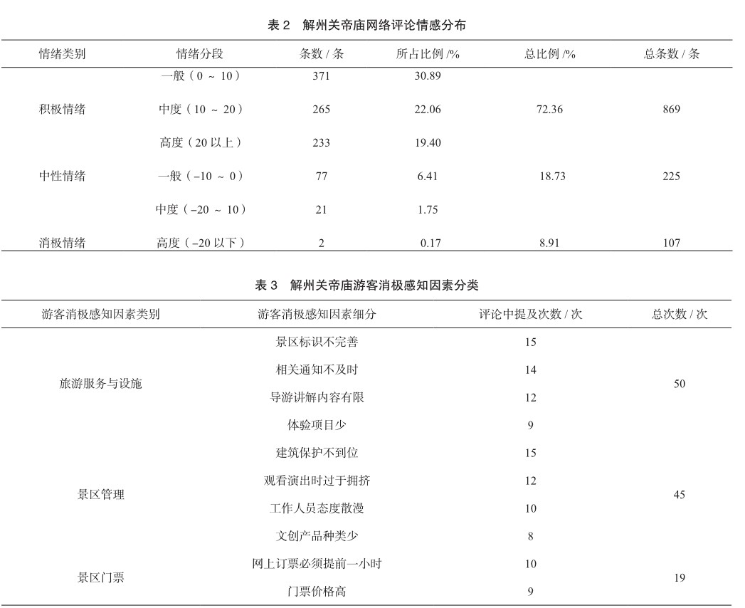 摘 要:本文选取山西省运城市解州关帝庙作为案例地,收集携程网、马蜂窝和小红书等平台游客的在线评论和游记数据,一方面,借助ROST CM6软件,运用网络文本分析法研究游客感知。结果表明,游客感知主要集中在人文资源和旅游设施与服务这两方面;游客对解州关帝庙的情感倾向以积极情绪为主。另一方面,利用NVivo11软件对游客消极感知因素进行整理,发现游客对景区管理、旅游设施与服务及景区门票存在不满。针对游客的不满,本文从加强文物保护、完善景区管理体系和基础服务设施、创新旅游活动和设计特色文创产品等方面给出了提升传统文化旅游景区游客满意度的对策建议。