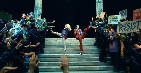 由于主人公亚瑟被囚禁在阿卡姆,肉身受到严格的监管,创作者遂选择了以狂想曲式的歌舞和唱段,来铺垫亚瑟在主副人格间来回冲撞、逃避现实的过程。遗憾的是,本不以歌舞片调度见长的导演托德,显然未能成功将这一传统类型和影片精神分析的诉求相结合。