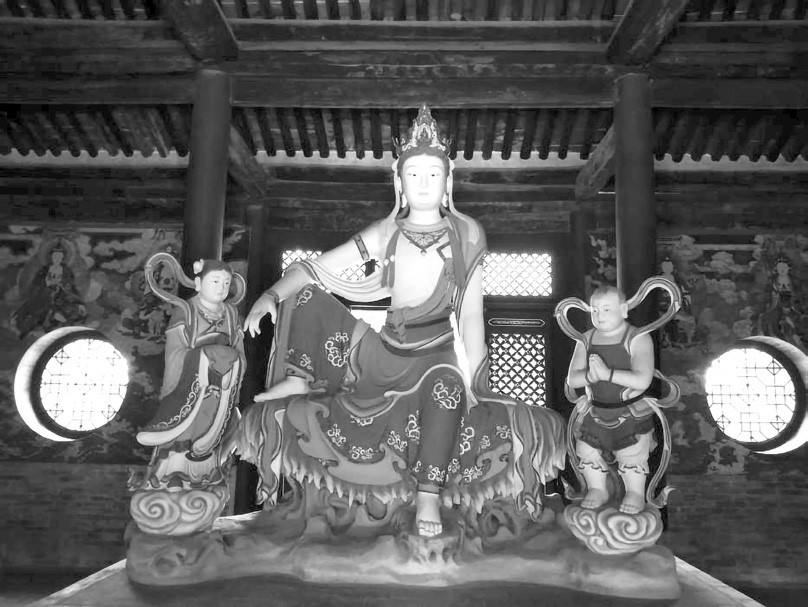 圆通殿 坐于高台之上,面阔五间,进深四间,单檐歇山顶,前接三开间单檐歇山顶抱厦,屋面均为灰陶筒板瓦,蓝琉璃瓦剪边、集锦,蓝琉璃脊饰。殿身明间梁架结构为七檩前后廊,梁架上绘有彩色飞龙、墨色云纹等图案,异常精美。殿内塑观音菩萨及善财童子和龙女像,壁画绘十二圆觉像。