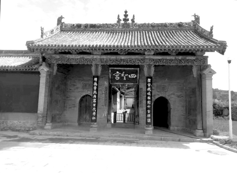山门位于四圣宫的西南角,坐东向西,为一层三门式殿阁建筑,面阔三间(长10.1米),进深四椽(宽6.86米),通高7.65米,单檐悬山顶,顶部的正脊使用了名贵的琉璃雕花筒子,正脊的中央竖立有宝瓶,左右两侧分别是琉璃狮、象。大门南北两侧的影壁上分别雕刻有青龙和白虎,作为镇观神兽,雕工古朴,花纹精美。进入山门,眼前为一道整齐的长廊,长廊的尽头为一座长方形的琉璃影壁,据早年曾担任曹公村会计的侯位禄老先生讲述,影壁原本为琉璃壁画,内容为“姜太公渭水垂钓图”,可惜于“文革”期间被毁。长廊位于四圣宫的最南侧,坐南向北,共有十二间(长30.96米),进深二椽(宽3.25米),单檐硬山顶,通高 5.375米,为清代建筑。长廊的北侧即为道院、四圣宫院、关帝庙院等三个连为一体的院落。具体次序如下:东面为宫观住持住宿修行的道院,中间为供奉“尧舜禹汤”四圣的中院,西面为清代续建的关帝院。四圣宫规模较大,布局灵活,采用三条轴线,以院落的方式组织建筑布局,将山门放置在西南角处。中间轴线建筑高于左右两条轴线上的建筑,反映出空间的主从关系和沿中轴线序列层层递进的空间序列。三个院落布局完整,建筑宏伟,属于典型的传统道教建筑风格。