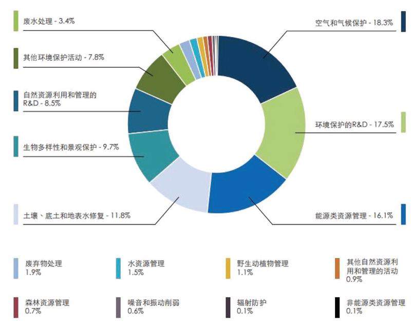 从图表中可以看出,意大利在2022财年的绿色预算中,对各类环境活动的资金拨款比例,揭示了财政政策中的资源分配策略。例如,空气和气候保护拨款的占比为18.3%,反映了政府在应对气候变化和改善空气质量方面的坚定信心;环境R&D(科学研究与试验发展)和能源资源管理分别占17.5%和16.1%,这不仅彰显了财政对环境治理的积极支持,更透露出政府对可持续技术革新和能源转型的远见。