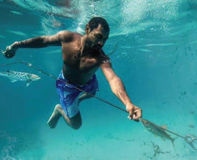 但无论哪种捕鱼方法,潜入海底空手抓鱼始终是海人的独特绝技。海人从小就练就了潜海的本领。马绍尔群岛的孩子能像鱼那样游泳;新几内亚北部的马努斯岛的孩子能掌握高难度潜水技巧;在特鲁克岛,海男为了潜得深、潜得快,会在肩上扛块大石头,或腰上带上重物下潜,到海底抛掉重物,立即抓鱼。快看,在浅海区的珊瑚礁丛中,一大群海人正在各自的活动水域赤手空拳地潜到海底搜鱼、追鱼、抓鱼,甚至有的海人潜入海底,敲开砗磲的贝壳,取出贝肉再浮出水面!