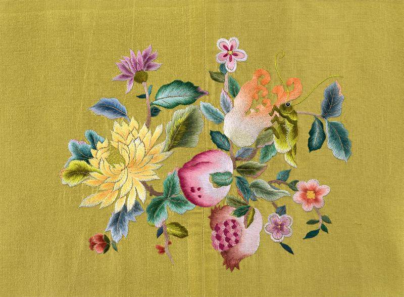 常沙娜先生在书中曾这样介绍京绣:“京绣是中国刺绣百花园中的一朵绚丽多姿的奇葩,它以图案秀丽、针法灵活、绣工精巧、形象逼真为主要特征,以用料考究、纹样吉祥、宫廷色彩浓郁为主要特点。”京绣是在以北京为中心的地方绣种上发展起来的皇家工艺,它产生于天子脚下,明清时期主要为宫廷服务,以服饰及实用品居多,京绣用料贵重,不惜工本,除纯真丝面料和绣线外,还采用珍珠、宝石、金银线等高档名贵材料刺绣装饰,奢华富丽为其他绣种所不及。因此京绣又被称为“宫绣”,曾被列为清代“四小名绣”之首,并与景泰蓝、雕漆、玉雕、牙雕、金漆镶嵌、花丝镶嵌、宫毯传统手工技艺一并合称为“燕京八绝”,闻名于世界。