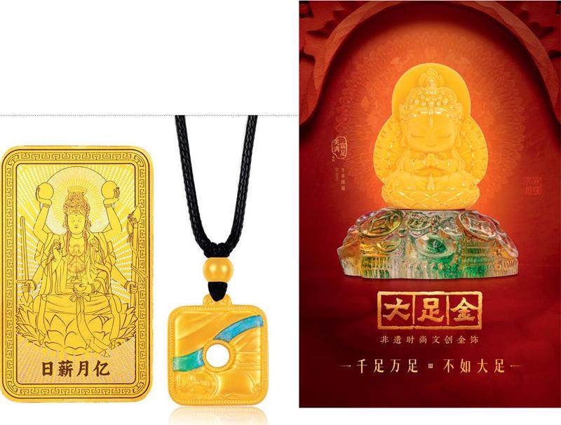 中国珠宝最新推出的“大足金”系列,与世界文化遗产“大足石刻”联名,选取慈悲安详的巨型卧佛、金碧辉煌的千手观音、庄严威风的大足狮等经典元素进行创新演绎,独具巧思地选用萌趣生动的年轻人视角,重塑千年大足魅力,将宏伟壮观的大足石刻图案与当下年轻人关注的“升职加薪”“祈福好运”等流行话题巧妙结合,工艺精湛、趣味十足,既满足当代消费者对于文化自信和民族荣耀感的追求,也符合年轻人的审美,“大足金”品类覆盖了收藏储值、精美首饰、趣味文创等,为不同需求的消费者带来全新文创金饰消费体验。