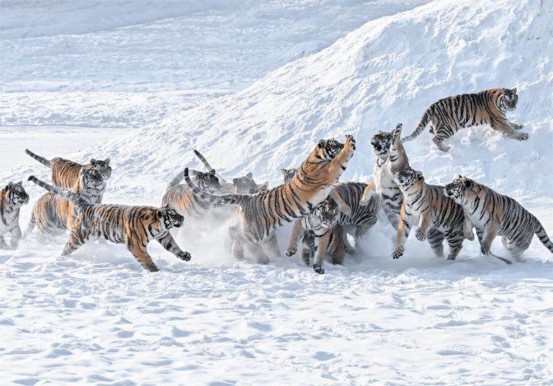 2025年1月,黑龙江牡丹江,海林市横道河子虎园,国家一级重点保护动物东北虎在冰雪地里打逗玩耍,威猛姿态尽显霸气。