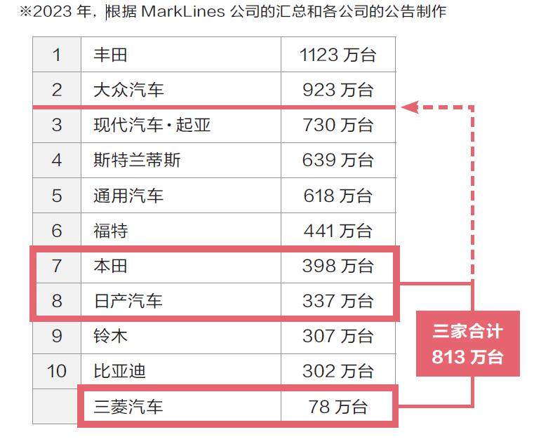 倘若顺利,不到两年后,我们将看到一个“小丰田”出现。以2023年销量作为计算基础,本田全球销量398万辆,日产337万辆,三菱78万辆;合计813万辆,仅次于丰田(1123万辆)和大众(923万辆),超过现代(730万辆)。