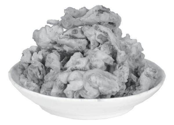 油渣通常有两种,一种是边油渣,一种是肥肉油渣。边油白如雪,含油量是最高的,熬油后剩下的油渣模样如木耳。边油出油多,留渣少,一头猪的边油能熬出一大盆好猪油,却出不了一碗油渣。而用肥肉熬油,出油率低于边油,出渣率大大高于边油。