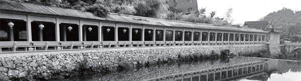 阴天,又刮着微微的风,在战友陪同下,我从岩头古村的南门步入。只见一棵有三百多年历史的香樟古树,遮天蔽日、古老苍劲。古树西侧,是建于明朝嘉靖年间的丽水桥。经过几百年的风雨洗礼,古桥仍然坚固如初。在古树东南侧,单檐“乘风亭”结构严密、外观朴实。亭内挂了对联:茶待多情客,饭留有义人。亭子里长年备有茶水,供人免费饮用。