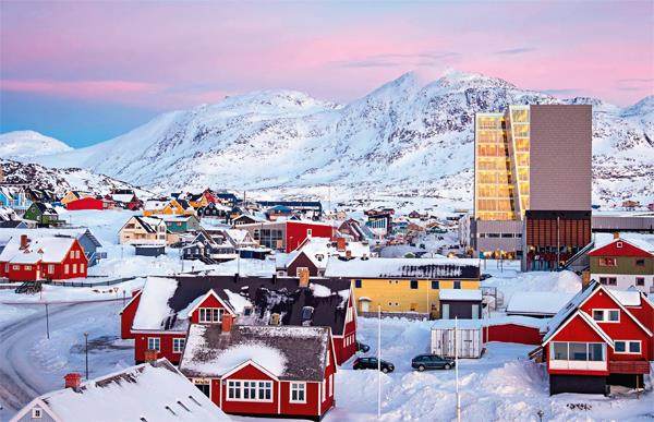 ■ 格陵兰岛的首府和最大港口城市努克受北大西洋暖流影响,气候相对温和,冬季平均气温很少跌破零下十摄氏度,附近海水基本终年不冻,适合捕鱼。这里生活着岛上约1/4的人口,房屋色彩缤纷,宛如童话世界中的小镇,为漫长的极地冬季带来了视觉上的温暖感受。从努克现代化的市中心出发,只需步行几分钟即可抵达风景如画的峡湾之畔,都市的活力与大自然的宁静和谐地融为一体。