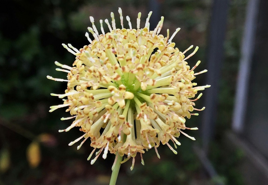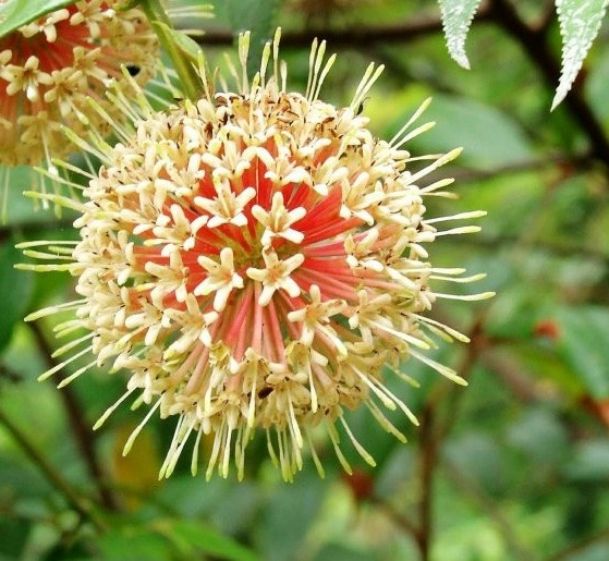 除了极具特点的倒钩刺,钩藤的花序也很有辨识度。其头状花序虽然个头不大,直径不超过2厘米,但形状圆润饱满,色泽金黄耀眼,而且还有一根长达5厘米的细长花梗,仿佛一盏盏圆形的迷你灯笼悬挂在叶腋,分外妖娆美丽。再细看花序中的每一朵小花,都是管状漏斗形的,先端有5裂,裂片近圆形,外面无毛或略被粉状短毛,边缘有时有纤毛;细长的花柱伸出冠喉外,柱头棒形。