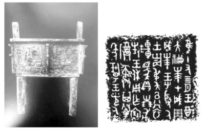 叔虞方鼎 晋侯墓地中发现了叔虞的儿子燮父的墓葬,墓中有一件方鼎,出土时已破碎,为盗墓爆破所致。这件器皿器型方正,四角和每个侧面中部都有扉棱,侧面饰云雷纹为底的兽面纹,被断定为西周早期的器皿。鼎内一侧腹部铸有铭文,共8行48字。因为其中有“叔虞”二字,被命名为“叔虞方鼎”。参考李伯谦先生《叔虞方鼎铭文考释》一文,可知铭文内容为:某年十四月,王在成周举行祭祀大典,仪式结束之后,王会见叔虞,并赏赐了华服、车、马、朋、贝等物,叔虞为了纪念此事,称颂王的美德,便铸造了这件鼎以志万年不忘。铭文中的叔虞应为晋国的始祖唐叔虞,其所对应的王应为周成王。