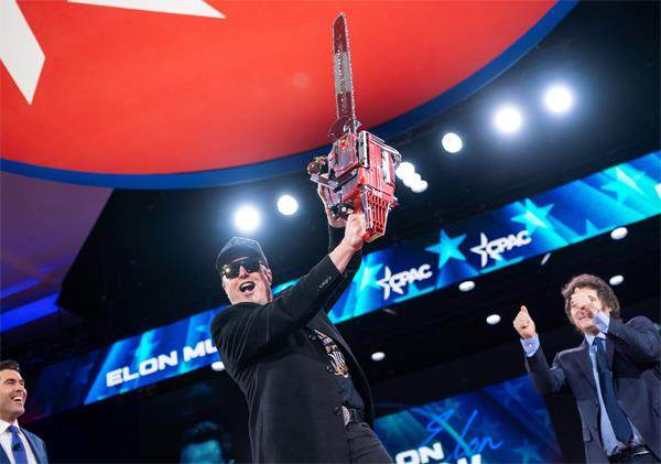 2025年2月20日,2025年保守派政治行动会议在美国马里兰州召开。会上,阿根廷总统米莱(右)向马斯克赠送了一把电锯,以示对其大刀阔斧推动美国行政体系改革的支持。图为马斯克高高举起这把电锯,接受与会支持者们的欢呼。