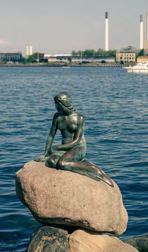在哥本哈根朗厄利尼海滨的礁石上,一个高仅1.5 米的人身鱼尾的美丽少女静静地坐在海畔石上,她背对大海,眼眸低垂,若有所思,恬静而忧伤。她便是世界闻名的小美人鱼铜像。1913 年,丹麦雕塑家爱德华·埃里克森以安徒生童话《海的女儿》为蓝本,将这个为爱献祭生命的海洋精灵永远定格于此。