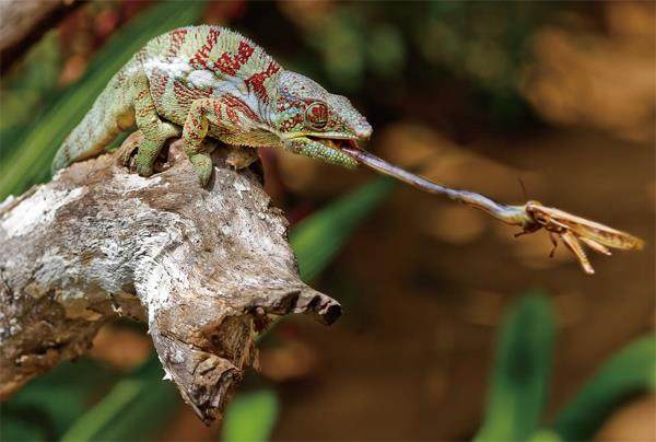 一只变色龙蹲在树枝上,伪装得像块苔藓,突然——“嗖”!一道肉眼几乎捕捉不到的“闪电”从它嘴里射出,0.12秒后,一只倒霉的蝗虫已被“秒杀”,连挣扎的机会都没有。身体动作迟缓的变色龙,却拥有能高速捕获猎物的舌头。