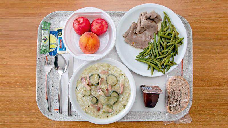 罗马圣卡米洛–福尔拉尼尼公立医院某天的午餐是西葫芦火腿意式烩饭,还有牛肉和青豆、桃子和李子、巧克力布丁以及黑面包。这是意大利常见的病号餐。晚餐则比较清淡——意式烩饭换成了汤。