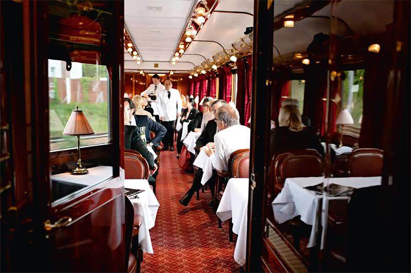 两次世界大战期间,火车餐饮迎来黄金年代,餐车与“轨道上的美食”成为时代印记。在当年一些传奇列车上,餐桌都铺着白色桌布,侍者端上丰盛华美的菜肴供旅客享用。连接诺曼底海滩与蔚蓝海岸的“蓝火车”、往返巴黎与阿姆斯特丹的“北方之星”、横跨巴黎至伦敦的“金箭”,都曾提供过顶级菜肴,比如热月龙虾、羊脑糕、烤鹧鸪、马拉斯加樱桃舒芙蕾等。