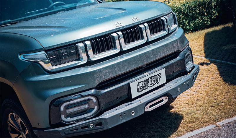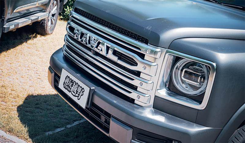 首先看造型,两辆车采用完全不同的造型方向。H9采用比较方正的复古的硬派设计,而BJ60则采用相对比较圆润的设计,直观的视觉感受BJ60的车身看起来更大。为什么呢?首先因为它用的型面设计都比较“膨胀”,显得比较有张力。同时它的车头设计也比较高。我身高174cm,其发动机盖基本已经到我胸部位置了,而H9则在腰部往上,两者高度差距超过将近10cm。所以从气势来看BJ60相对来说高一些。
