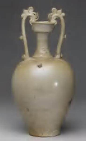 这件是唐代的白瓷。当时烧造的工艺水平不是很高。现在我们觉得这个线条很艺术,其实是因为当时工艺的弊端——当时,釉的流淌是无法控制的。在正常情况下,现代瓷器上釉是要上满的。当时,如果釉上满了的话,一烧就流到底下了,一流到底下就粘起来了,瓷器就可能坏掉。所以,这些优美的线条不是刻意创造的,是为了防止釉的流动,并给它留下流淌的空间。这件瓷器的重点是,它的造型非常能代表唐代的状态。这件瓷器很大。这种造型的瓷器在很多博物馆都有,每一件都不一样,这件是最精彩的一件。它的形状非常雄壮、很饱满、有气势。在细节上,它做得非常精致。它的盘口像一个盘子一样,两边的耳是把手,被做成了龙。龙的姿态很优雅,线条很优美,非常有力量。