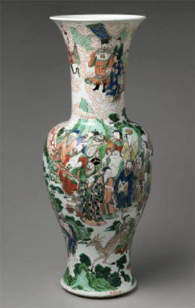 这是康熙时期的五彩,它的绘画性非常强,上面画的人物非常多。人物画在中国古代是不太受重视的。中国古代绘画审美最核心、评价最高的是文人画。早期时候山水都不是文人画。宋代时,王希孟画的《千里江山图》也不是文人画。那时的文人画是画竹子、石头、兰花。但是,到了元代,山水成了文人画的主体,文人画的主题开始扩展。但在任何朝代,人物画都没有进入到文人画的体系。人物画在中国古代绘画的地位相对不高。但有趣的是,瓷器上的人物画特别多,尤其在康熙时期,这是因为当时小说很流行。明代晚期官窑停烧了,一方面是民间需求非常多元,一方面是海外贸易。为了满足民间需求,匠人就会画小说插图。