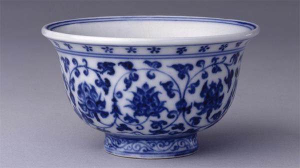 这是压手杯。前面提到颜色、绘画,这是装饰纹样。这种纹样是缠枝莲。有一个西方学者写了一本书,叫《莲与龙:中国纹饰》,前两年还翻译到了国内。他认为,缠枝莲和龙纹是最象征着中国的两种纹样。