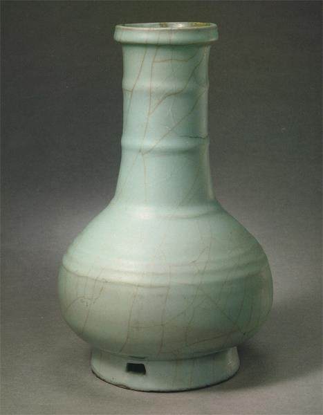 这是宋代官窑的弦纹瓶,上面有着一层一层的弦纹。这些弦纹很像丢石子在水里纹理荡开的感觉。在下面的那部分,这些纹理像是碰到了壁,变得很密集。一层一层的弦纹非常有节奏感。这件瓷器几乎没有装饰,大家可以把它理解为结构,但它又有非常强的装饰性。在宋瓷当中,这种极简类型能够增加装饰的方法很少,这时反而凸显了它在造型上面所取得的成就。