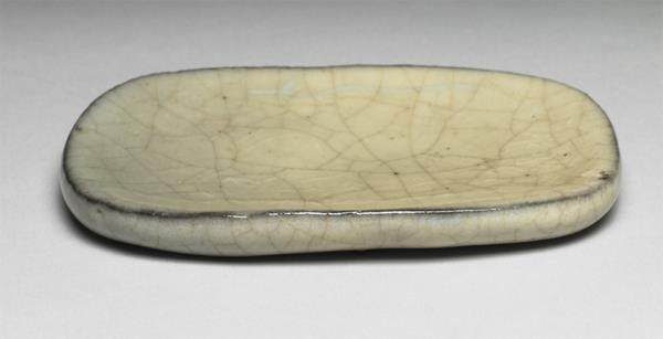 这件瓷器是一个椭片,是笔掭(毛笔蘸墨后把笔尖上的墨抹匀的器具)。这件瓷器当盘子装水也装不了多少。中国人经常讲“无用之用”——这件器物上比较好地体现了这种文人审美。它既是天然的,又有很深的人造痕迹。这种线条很像书法里的“屋漏痕”(颜真卿的笔法被形容为“锥画沙、屋漏痕”),即从自然现象去捕捉美感,所以,乾隆皇帝是非常了解的。这件作品朴素无闻,而且大家都能想象出来它是怎么制作的——跟小孩玩泥巴差不多。但是,这件作品又有很明确的美学诉求,比如,这条黑边是故意的转折,因为转折的地方挂不住釉,釉是泥浆的状态。我们把最好的泥片扔到泥浆桶里面捞出来,因为它尖,釉就会流淌,所以会露胎。所以,这件瓷器的黑边不是画出来的,是底色露出来的。