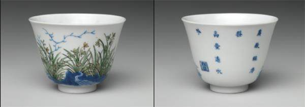 这是青花十二花神杯,这是康熙时期非常著名的一组作品。每一个月都有一个花神(在正面),背面有一首诗歌,背后有一个小印章。杯子上有诗书画印的结合。中国画几个最主要的元素,诗书画印并不可少。这样一件器物很像一个小型展览会或小型画展。大家可以看杯口,上面有青花字。如果现场观看会非常明显,可以看透杯子内壁,因为瓷质很好,特别薄。所以,制作它们的工艺难度很高,因为它要做得非常透。它薄到一个成年男性用力捏就能捏破的程度。欣赏瓷器包含很多部分,我们可以把它当作小型画展来看,也能欣赏它的质地美感,比如,轻、薄、透,釉面的温润等。