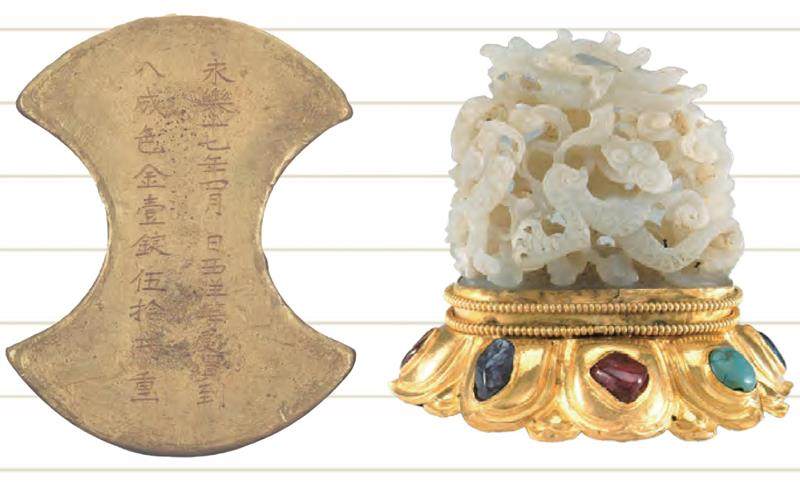 梁庄王朱瞻垍(1411—1441)是明仁宗的第九个儿子,其生活年代与郑和航海时期几乎重合。当代考古人员在其墓葬中发现了大量精美绝伦的金银珠宝,其中不乏世界公认的四大名贵宝石——红宝石、蓝宝石、祖母绿和钻石。通过科学的地质分析,这些宝石原产地遍布东南亚、西亚地区。更引人瞩目的是,考古人员在此墓出土了一枚金锭,上面清晰地刻有“永乐十七年四月 日西洋等处买到八成色金壹锭伍拾两重”的文字,清晰地表明了此金锭是郑和在第五次下西洋时带回的西洋贡金,后由宫廷制成内库金锭后赏赐给了梁庄王。
