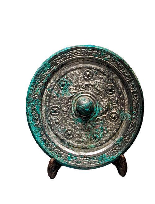 “人民昌·中国强”汉代铜镜是我国目前发现的唯一带有“人民昌”“中国强”吉语铭文的铜镜。汉代是中国封建社会的强盛期,社会生产力有了巨大飞跃,因此汉代也成为中国铜镜发展史上的高峰期。该镜为圆形,直径为22.3厘米,厚约0.7厘米,镜背中心为半球形镜钮。整个铜镜的镜背布局精巧、图案华丽,以镜钮为圆心,以同心圆式的结构分多个圈层铸造了大量纹饰和文字。据统计,镜背上的纹饰有25种之多,如天禄、辟邪、青龙、白虎、朱雀、玄武、羽人持百枝灯、羽人飞仙等,这些图案都反映出当时的人们向往美好生活、祈求健康长寿的愿望。铭文全文是“天禄辟邪曰有喜,上有龙虎四时置,长保二亲乐无事,子孙顺息当大富,侯王寿命长,多贺君家人民昌,四夷皆服中国强”,47个古朴的汉字表达出人们对美好生活的向往和对国家富强、民族兴盛的追求。“人民昌·中国强”铜镜的面世,进一步佐证了汉代“中国”国家观念的形成,承载了中华民族的共同认知。