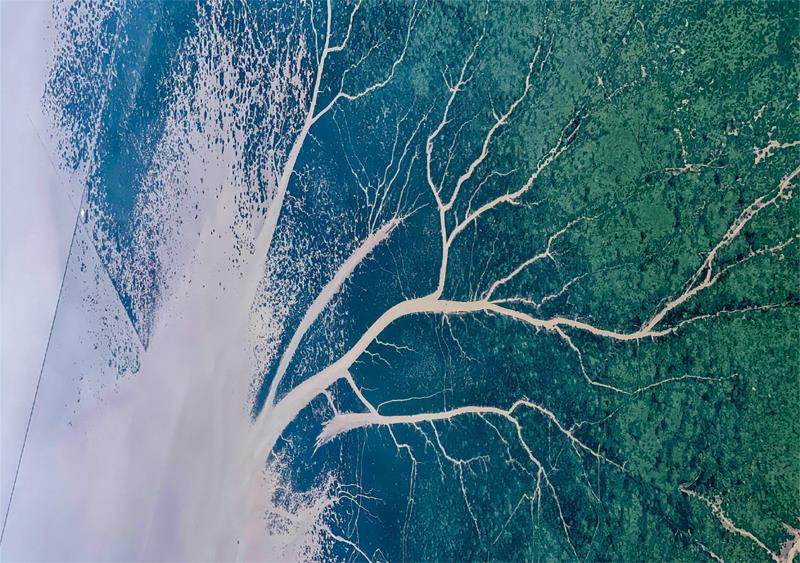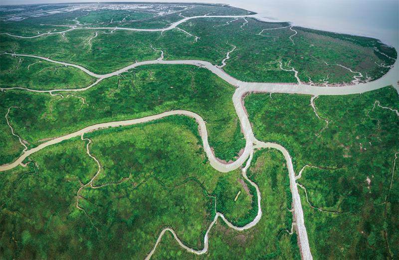 在卫星图上鸟瞰,可以看到长江入海的清晰形态:滔滔大江浩荡而来,在崇明岛分为南、北两支;南支经过长兴岛和横沙岛的时候,分为北港、南港;南港在口门附近被九段沙沙洲分为北槽、南槽。北支、北港、北槽、南槽四条水道注入东海,最终形成“三级分汊、四口入海”的独特格局。在这片辽阔的水域,崇明岛像一艘巨轮,静卧在南北分汊的中间。
