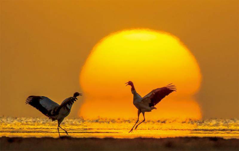 每年三四月份,在即将从越冬地飞往繁殖地的前夕或是迁徙途中,黑颈鹤便开始求偶。雄鹤们会展开激烈争斗,用舞姿与歌声赢得雌鹤的倾心:它们伸长脖颈上下舞动,展示自己曼妙的身姿,发出高亢动听的鸣叫,再展开双翼翩翩起舞。彼此心仪的黑颈鹤,会通过歌声与舞姿交相呼应,尽情地表达爱意。
