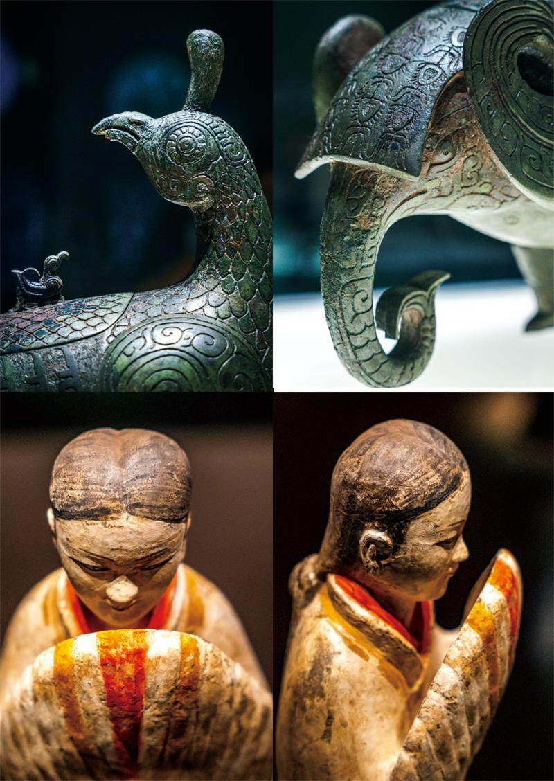山西博物院收藏有一件华美的青铜器——晋侯鸟尊,它以凤鸟回首为主体造型,鸟身直立,头微昂,高冠耸立,眼睛圆睁,目光投向远方。凤鸟体态丰满,两翼上卷,双腿硕壮,扇形短尾微翘,双爪紧扣地面,身饰云羽纹。显然,鸟尊那卓然于世的姿态是最引人注目的。然而,若不在摄影前做好功课,就很容易错过它最独特的设计——凤鸟尾部下方,一个象首悄然承托,其内卷上扬的象鼻与鸟的双腿共同构成了稳固的三点支撑,使得鸟尊更加独特。我在事先理解了“鸟身象尾”这一匠心独运的艺术特点后,拍摄时便刻意寻找角度,用镜头去捕捉和凸显这个隐藏的细节,展现古人的卓越智慧。