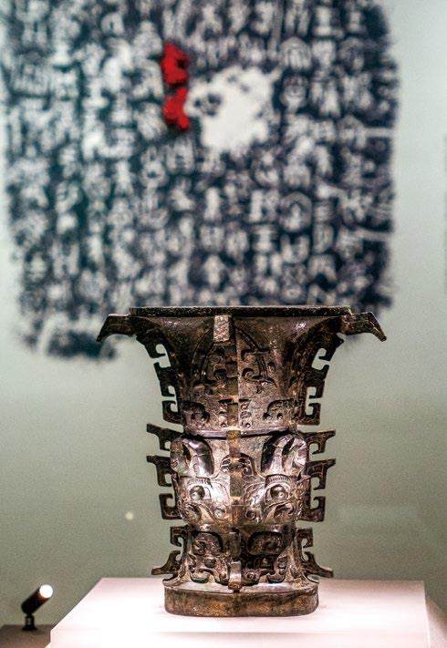 再说到宝鸡青铜器博物院的镇馆之宝何尊,这是西周早期一位姓何的宗室贵族所作的祭器,也是中国首批禁止出国(境)的展览文物,属国家一级文物。何尊作为西周青铜艺术的精品,它的造型固然值得记录,但它真正的价值,在于镌刻在内底的122字铭文中那四个尤为重要的字——“宅兹中国”。这是迄今为止发现的“中国”一词最早的文字记载,承载着“天下之中”的古老政治理念。所以在拍摄时,我想尽量在镜头中体现“中国”二字。我在现场观察到博物馆内悬挂有“中国”二字的背景后,就将文物作为主体,以“中国”作为背景进行构图,这样就能更好地诠释这件文物的历史价值。