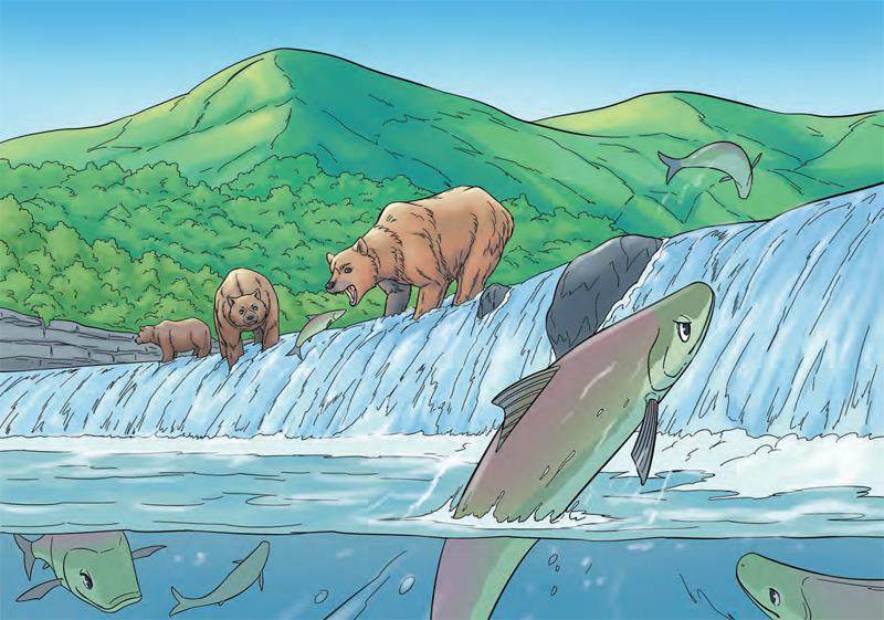 回家的念头激荡在每一条大马哈鱼的心头,回家的路刻在每一条大马哈鱼的血脉中。它们浩浩荡荡地朝入海口游去。越靠近入海口,那股要把它们往海里推的水流就越强劲。