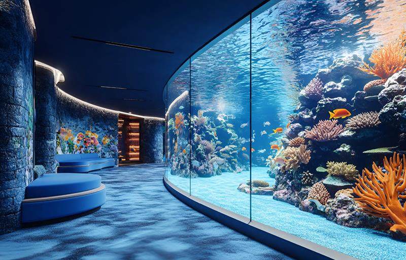 我们站在海洋馆的展缸前,可能会觉得眼前的玻璃和钢化玻璃没什么不同。其实不然,钢化玻璃的抗压和抗冲击能力虽是普通玻璃的三倍以上,对温差的承受范围也大,但钢化玻璃无法被直接切割和拼接,不能满足大面积和多元化的展示效果,且厚度过大会产生光学畸变,透过钢化玻璃看到的物体会变形。最关键的是钢化玻璃的边缘比较脆弱,在受压力和温度变化产生轻微形变时,有可能引发自爆。