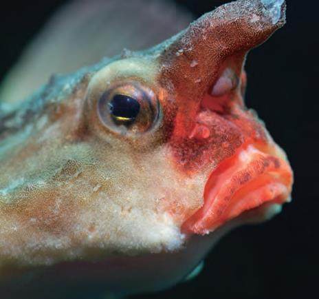 除了“烈焰红唇”,成年后,红唇蝙蝠鱼的头顶会有一个棘状突起,乍一看就像长鼻子。这个被称为“吻触手”的棘状突起,实际上是变异后的背鳍。吻触手会散发吸引猎物靠近的化学物质。香喷喷的吻触手加上诱人的烈焰红唇,构成“嗅觉+视觉”的双重陷阱。对于贪嘴的猎物来说,这简直不可抗拒。