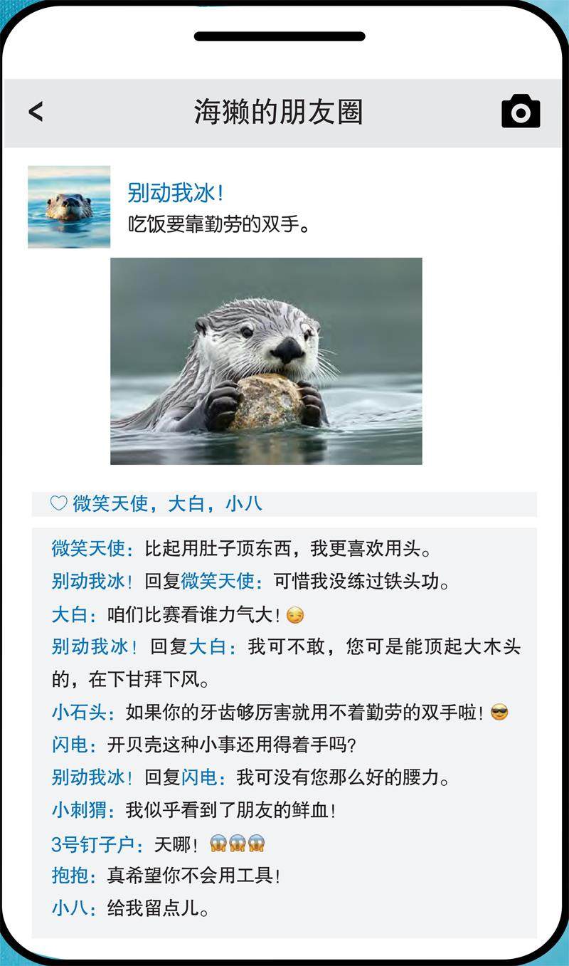 我们生活在海岸附近,既吃贝类、海胆、螃蟹,也吃一些海藻和鱼类,其中海胆和贝类是我们最爱的食物。我们平时喜欢集体生活,白天觅食,用我们灵活的双爪搬动石块,敲开坚硬的贝壳,大快朵颐;晚上按时休息,生活可以说非常有规律了。我们可是海洋里为数不多的会使用工具的动物,不仅头脑聪明,外形也十分可爱,我们还有个外号“卖萌一哥”!