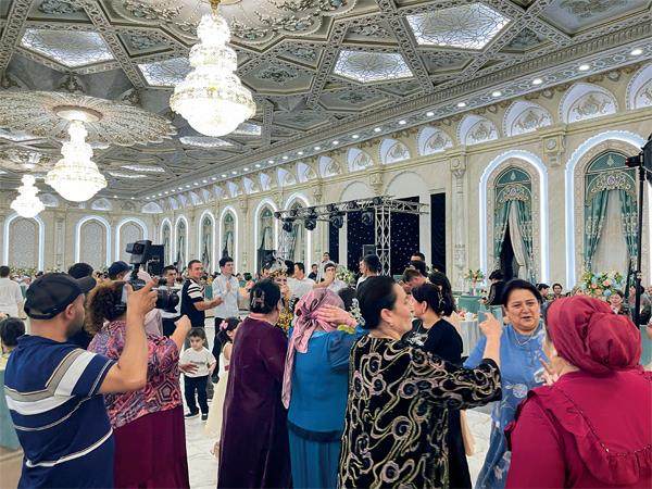 这是一场近千人参加、耗费约3万美元的大规模婚礼。乌国家庭办婚宴,新娘家负责晨宴,晚宴由新郎家负责。晨宴在婚礼当天或前一天举行,以抓饭为主食,原则上只允许男性参加,规模约300人。受邀参加晨宴,意味着被认可为亲人或挚友等关系密切的人,受邀者因之倍感荣耀。