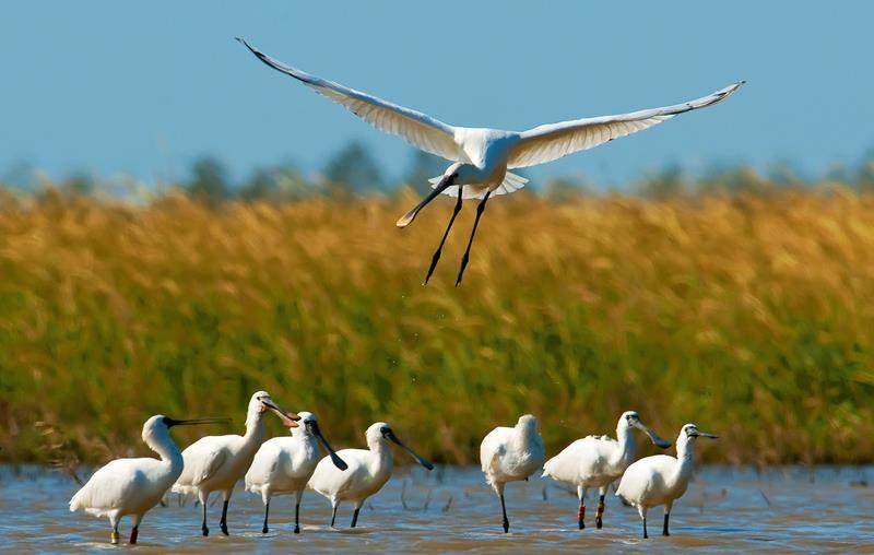 这里是我国东部沿海最大的滩涂湿地自然保护区,也是全球丹顶鹤最大的越冬地和众多濒危鸟类南北迁徙的重要驿站。每年冬季,90%以上在我国大陆越冬的丹顶鹤栖息于此。作为东亚一澳大利西亚候鸟迁徙路线上的重要停歇地,每年有近300万只迁徙候鸟途经保护区,常年或季节性居留的鸟类达50多万只。黑脸琵鹭、白鹳、东方白鹳、中华秋沙鸭、遗鸥、大鸨、白尾海雕、麂鹿等国家重点保护野生动物分布或途经于此。