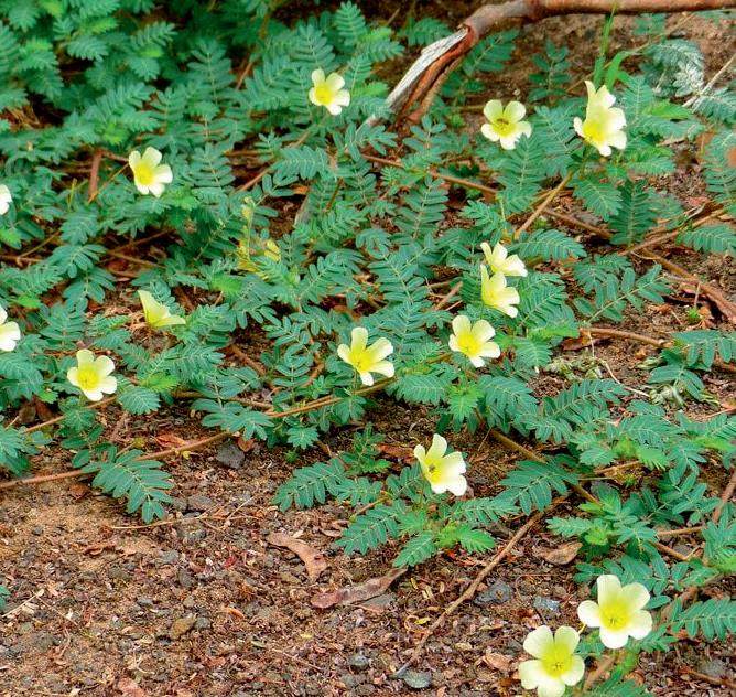 说蒺藜低调,是因为它与绝大部分植物的直立生长状态不同。蒺藜并非向上生长,而是以一种“躺平”的姿态,贴着地面四下生长,仿佛在拥抱大地一般。蒺藜的茎是从基部开始分枝的,全株枝长通常在20~60厘米,茎干和叶片均密布丝状柔毛。因为全株“躺”在地上横向生发,所以蒺藜的植株特别矮小,在野外草丛中极不起眼。