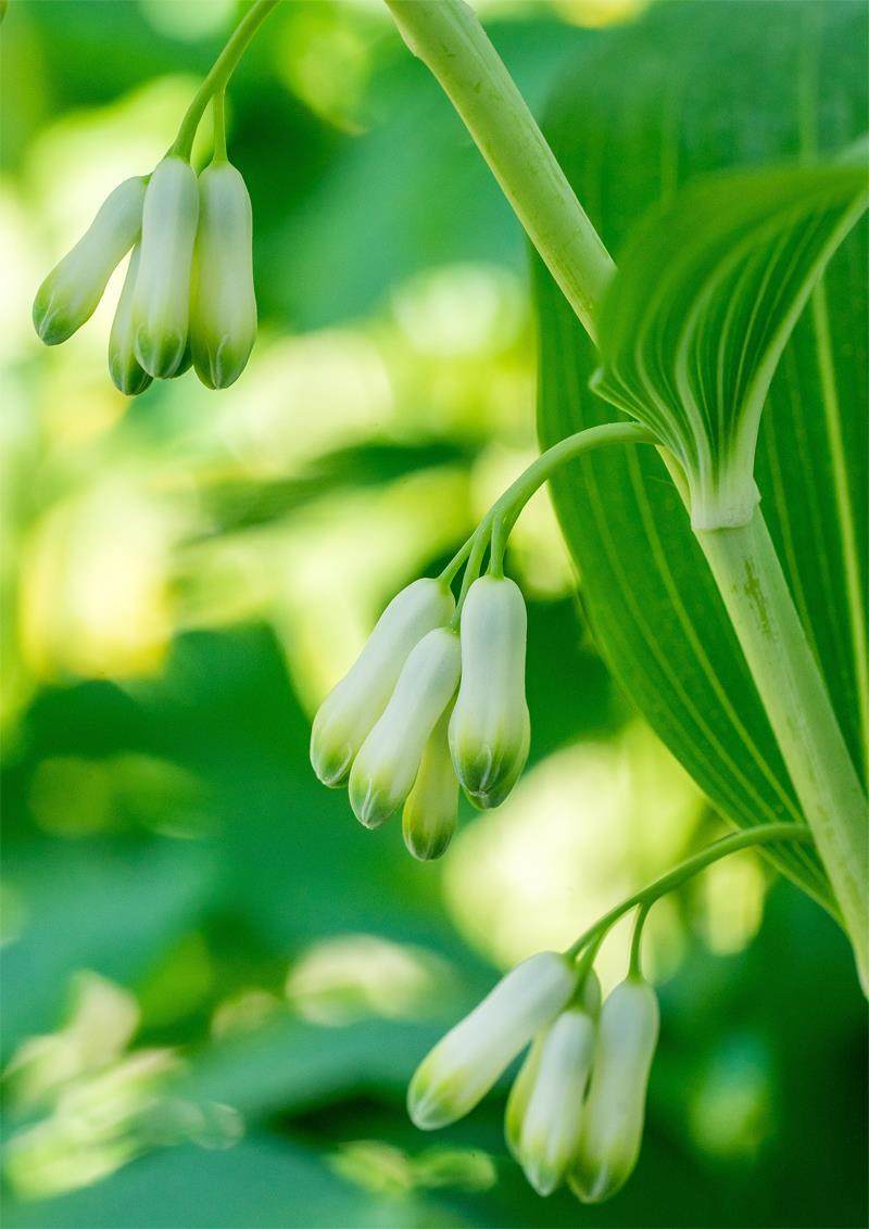 玉竹的花也比竹类的花更可爱、更有特色。其花序腋生,野生品种的每个花序通常有小花1~4朵,栽培品种则可达8朵;其花梗细长,小花的花被呈筒状,白色至黄绿色。每逢5—6月盛花期,一串串小巧精致的花朵挂满枝头,宛若串串迷你的铃铛在风中摇曳,令人爱不释手。玉竹因此又被称为“铃铛菜”。