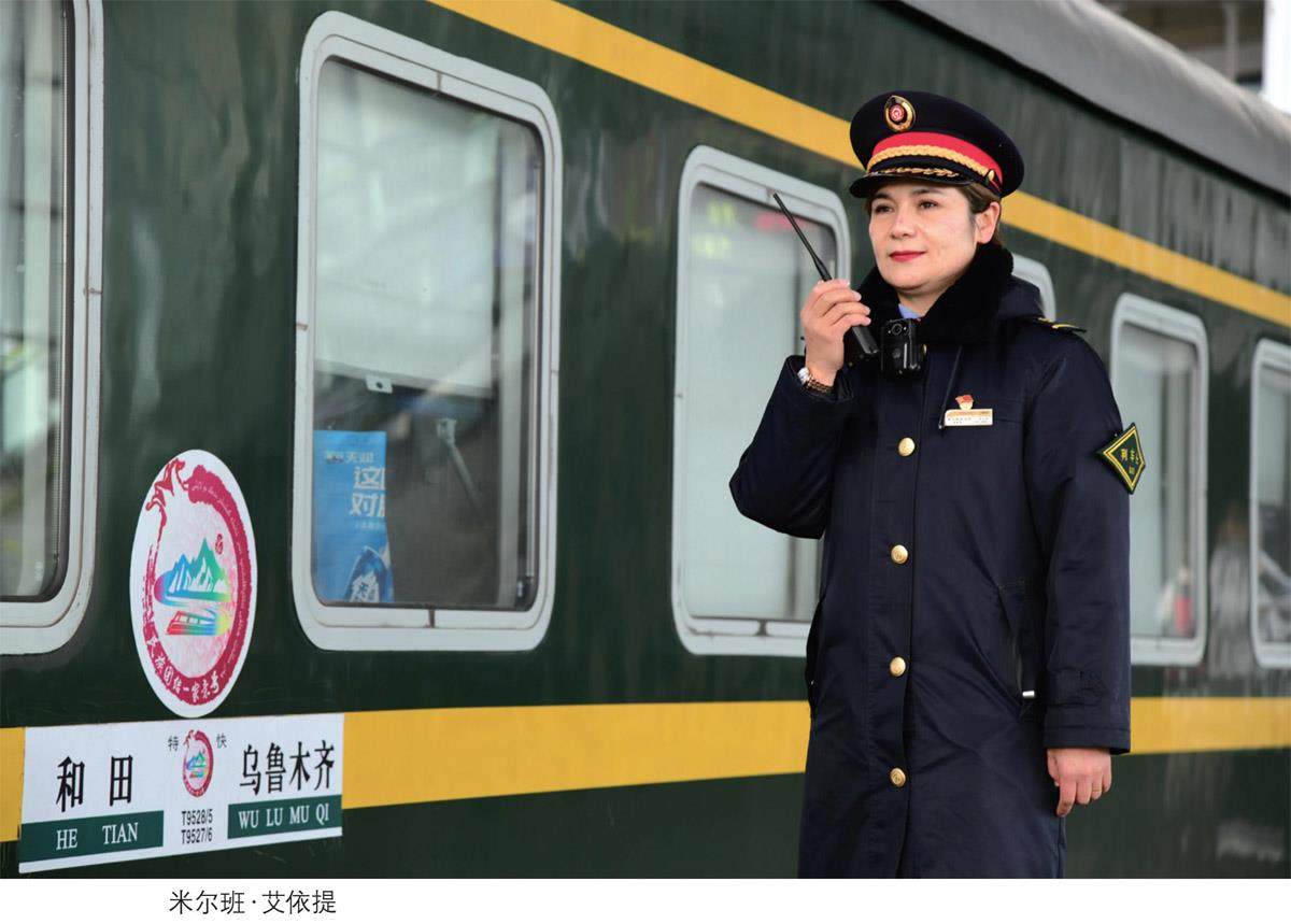 担任列车长后,米尔班跑遍了新疆境内的列车,也见证了新疆铁路的“跨越式发展”:绿皮车换成了空调车,在列车上烧锅炉的日子一去不返;南疆线从通到喀什,延伸到了和田;乌鲁木齐到北京的时间从72小时缩短到30多小时;“中欧班列”、“南疆红枣专列”、“旅游专列”越来越多……在她看来,铁轨上奔驰的不仅是列车,更是新疆发展的“加速度”。