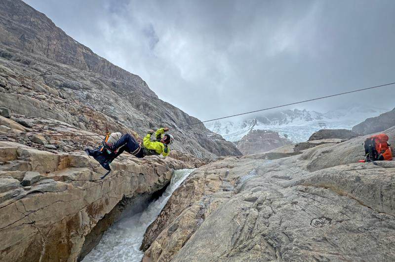 图为摄影师刘擎通过钢索渡河。何川老师说托雷峰就像是天堂,但去往天堂要经过地狱,而何老师口中的地狱便是攀登托雷峰的接近路线。从Chalten 出发至托雷峰脚下,单程距离便有38 公里且路途险象环生,图中为冰川融水形成的河流峡谷,也是去往托雷峰的必经之路,当地人在峡谷间架设了一根钢索,徒步者需要用牛尾保护自己,往返都需要攀越这条钢索。