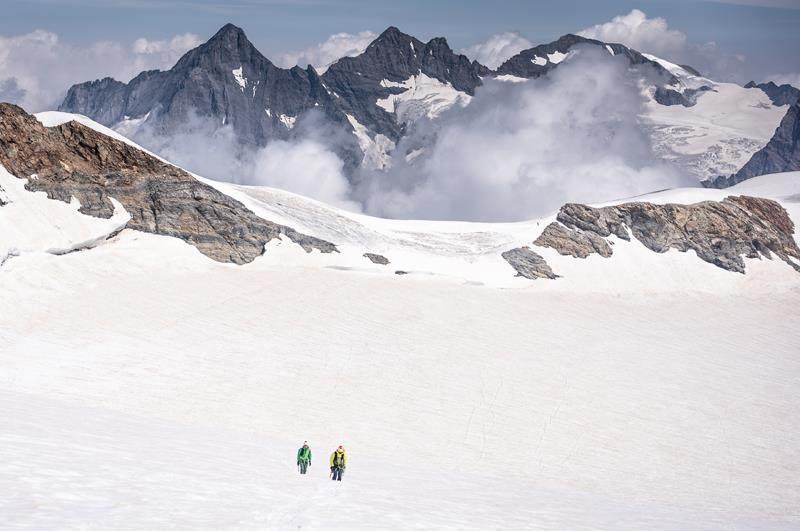 2024年作为阿尔卑斯六大北壁的最后一站艾格峰,又被称为“杀人峰”。因为夏天落石非常严重,何川老师、飞沙决定沿着艾格北壁的“天鹅绝唱”路线登顶,原计划当日登顶并下撤,由于岩壁湿滑,攀登难度远超预期,虽然在天还没亮时就出发攀登,完成攀岩路段已经天黑并且开始变天,巨大的云雾包围着艾格峰,未带露营装备的何老师、飞沙准备在山脊找避风处就地Bivy,第二天天亮时再继续冲顶和下撤。摄影师刘擎坐小火车转运至僧侣峰大本营接应何老师、飞沙平安返回穿越雪原时拍摄。
