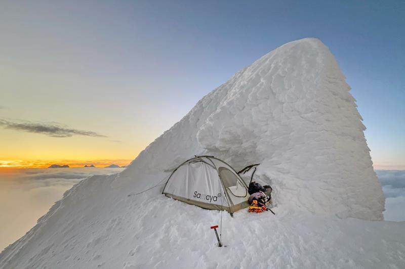 托雷峰之所以被何川老师称为天堂,就是因为其独特的冰雪形态,让攀登过程像是在造访一座冰雪城堡。图为攀登第一天的营地Elmo,何老师、飞沙把帐篷扎在了悬崖上的一小处平地。