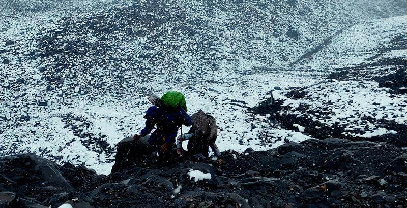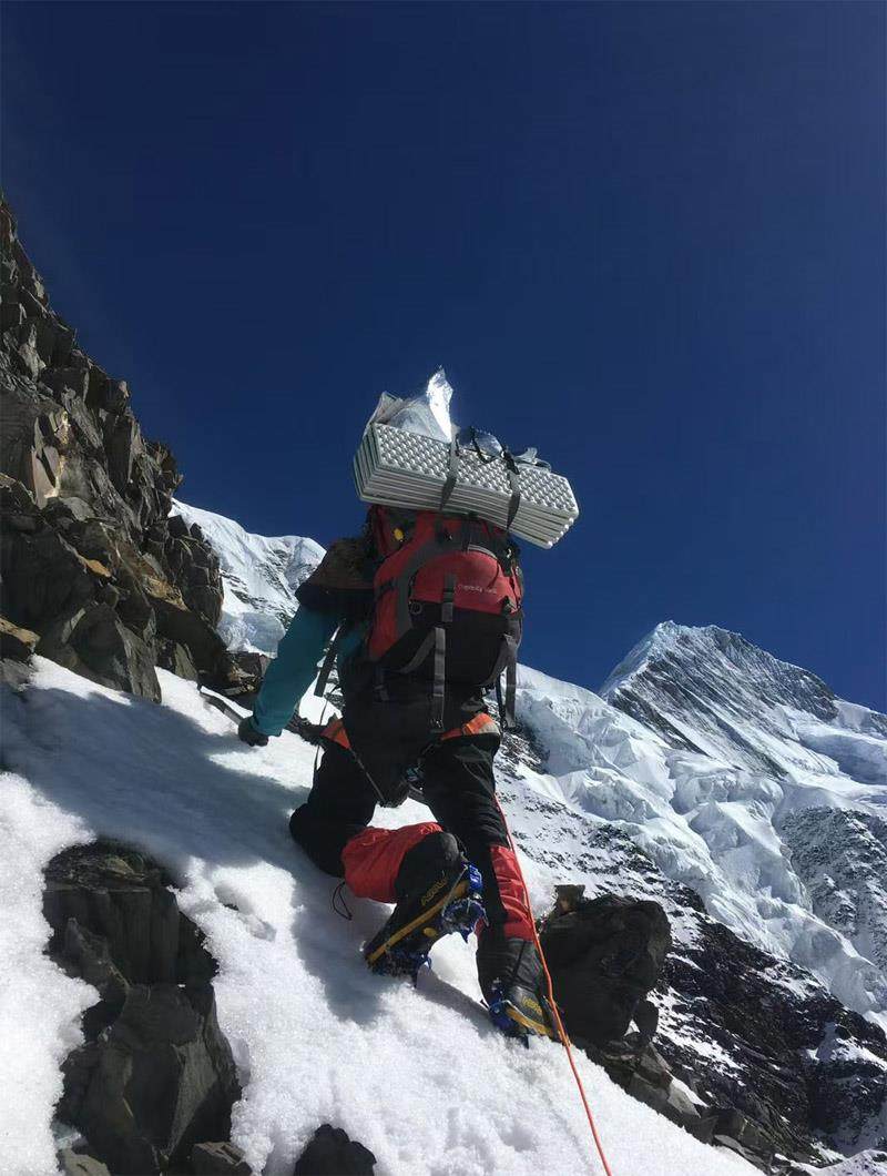 那次同样遭遇大雪,在海拔5900米处,积雪覆盖在陡峭的岩石山体上,肉眼看不到任何着力点,在一段岩石路段,他滑坠了10米左右,手脚都有不同程度受伤。最后,他在冰雪覆盖的岩壁上经历了36个小时的极限考验——身体蜷缩着,翻身都不行,睡袋受风雪侵蚀后几乎湿透。为了减轻负重,他损失了价值两三万的零散装备,狼狈下撤。