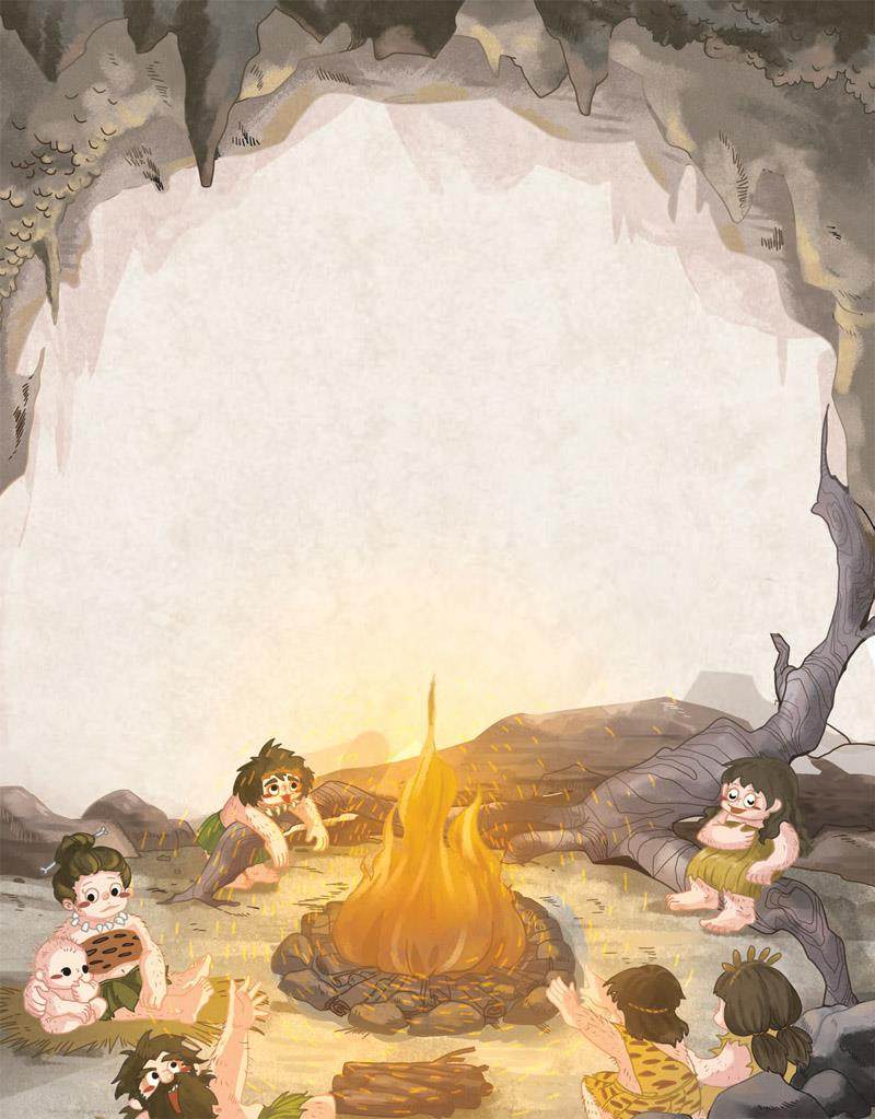 一天当中,最让他们感到快乐的是晚上。天色暗下来之后,男人们带着猎物欢天喜地地回来了;女人们扒开封火的石块,燃起了篝火。大家围坐在篝火旁开始烤肉吃,山洞里暖融融的,野兽看见火也都躲得远远的。大家开心地吃着肉和采摘的果实,火光映红了他们洋溢着笑容的脸庞……