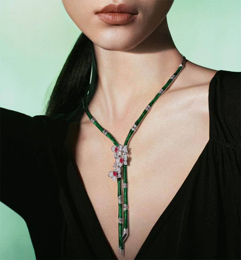 珠宝的叙事,首先藏在巧思密布的寓意设计里。设计师以世间美好情感与愿景为灵感源泉,将圆满、守护、祥瑞、思念等抽象情愫,转化为具象的珠宝形制。有的项链以流畅弧线勾勒出环环相扣的造型,暗合“永恒相伴”的期许;有的手镯则以细腻纹样雕琢出藤蔓缠绕的形态,搭配细碎宝石点缀其间,传递“生生不息”的美好祈愿。